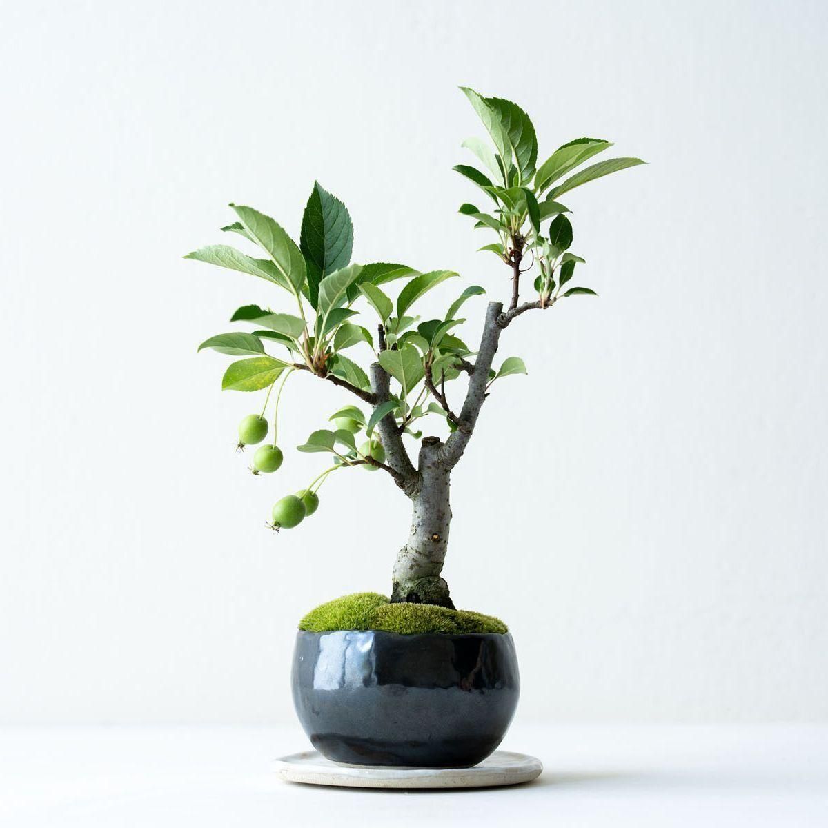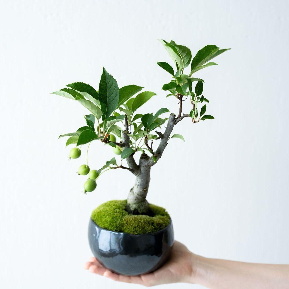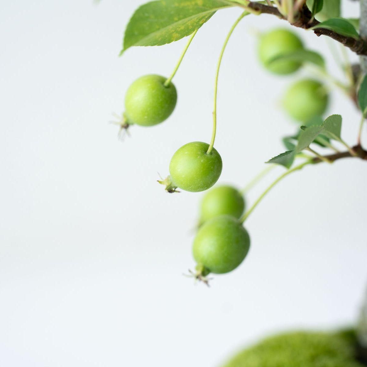 とても小さな林檎の木です。初夏に実を付け、秋にはまっ赤に色づきます。たわわに実った姿はたまらない可愛らしさ。この実は食用にもなり、ジャムやお菓子に用いられるそうです。しっかりお世話すれば毎年花を咲かせ、実が楽しめます。