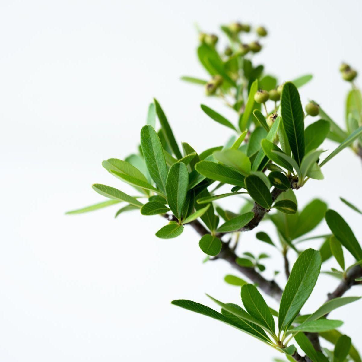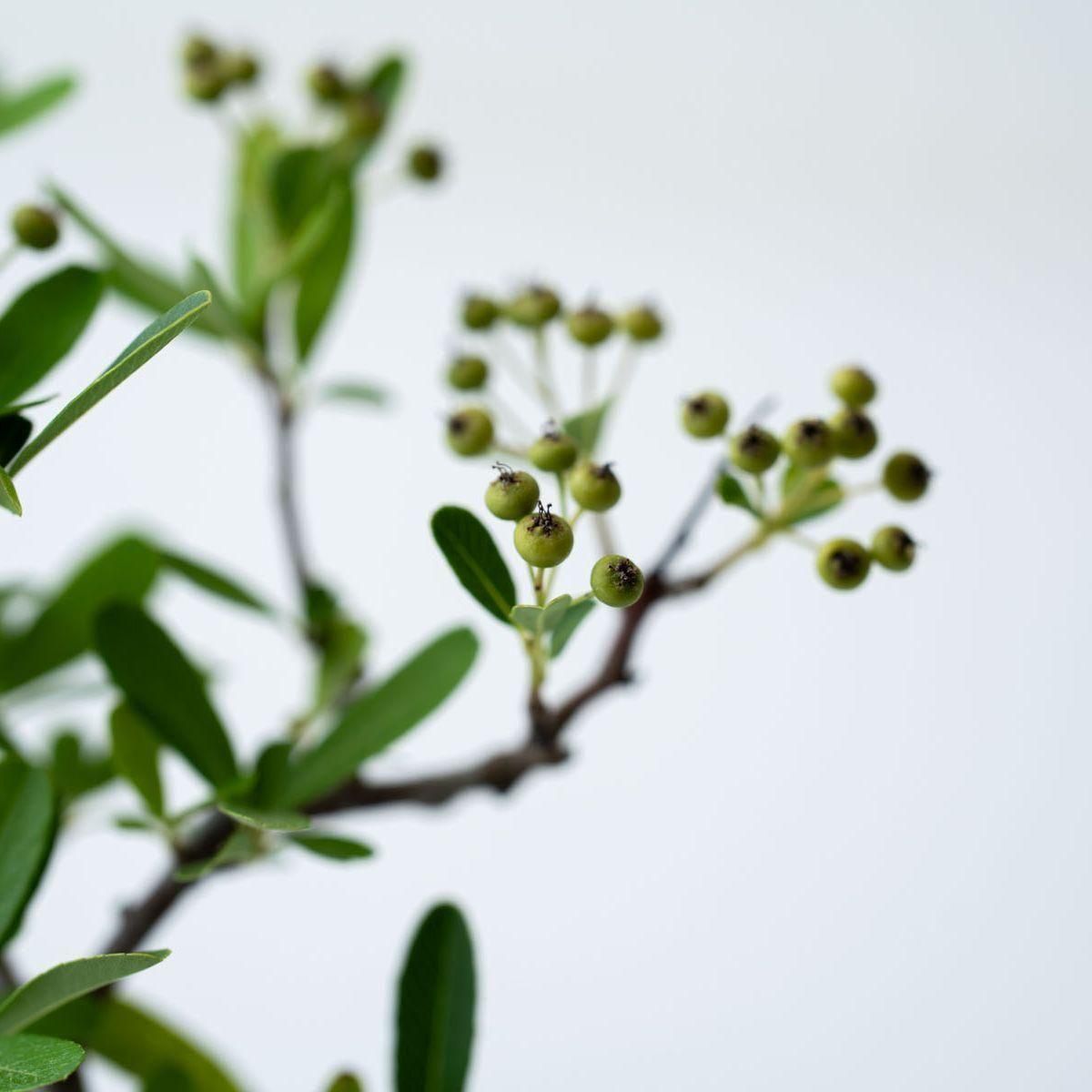 小さな白い花を咲かせた後は、緑色の実を付けるトキワサンザシ。この実は秋にかけて徐々に色づき、美しい朱色に染まります。花付き・実付きともに良いので、四季折々の変化が楽しい樹木です。