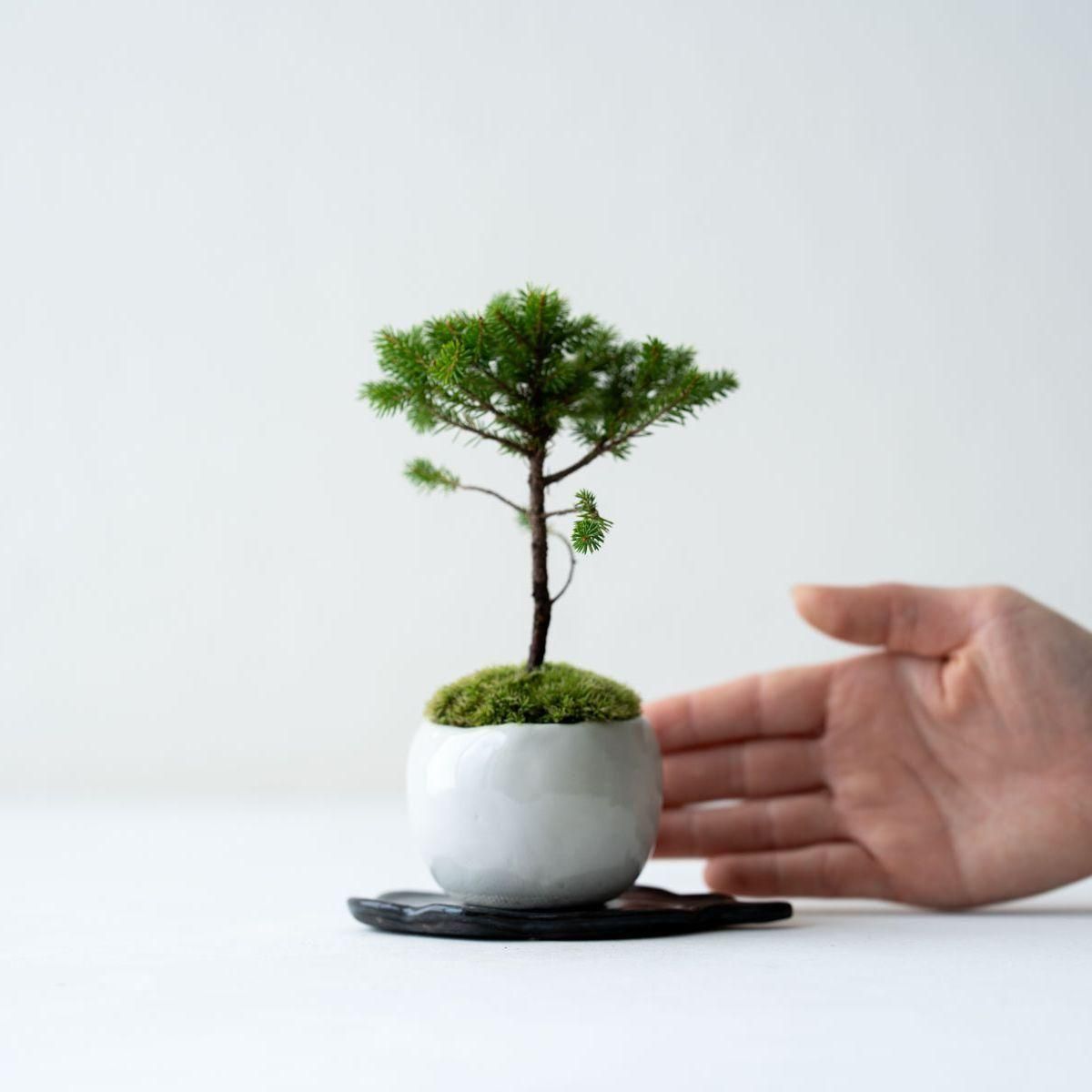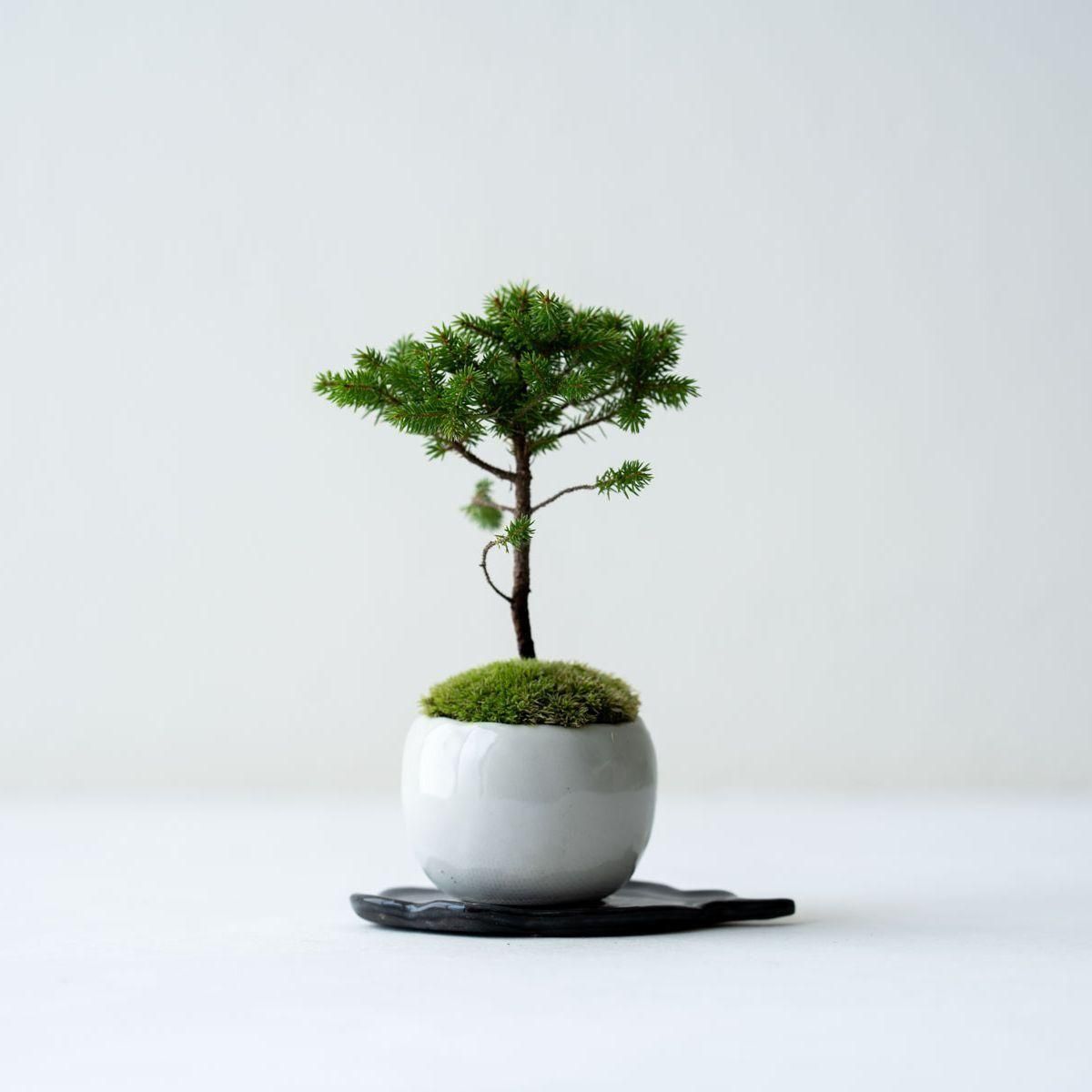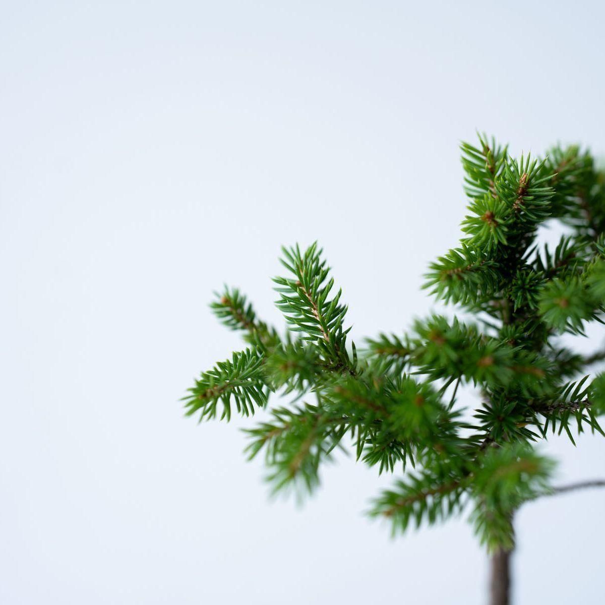野生的であり、しなやかな力強さを感じるエゾマツの佇まい。細やかな葉、黒い樹皮、野趣のある枝ぶりが特徴的です。その美しい佇まいは古くから愛され、樹齢数百年という名品の盆栽も数多く存在します。真夏の暑さは嫌いますので、その時期は日陰などで養生します。
