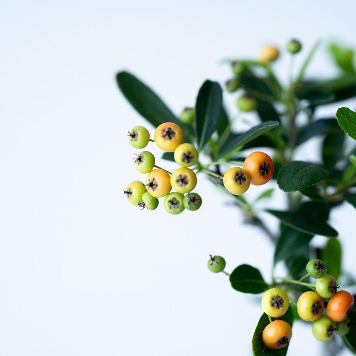 小さな白い花を咲かせた後は、緑色の実を付けるトキワサンザシ。この実は秋にかけて徐々に色づき、美しい朱色に染まります。花付き・実付きともに良いので、四季折々の変化が楽しい樹木です。
