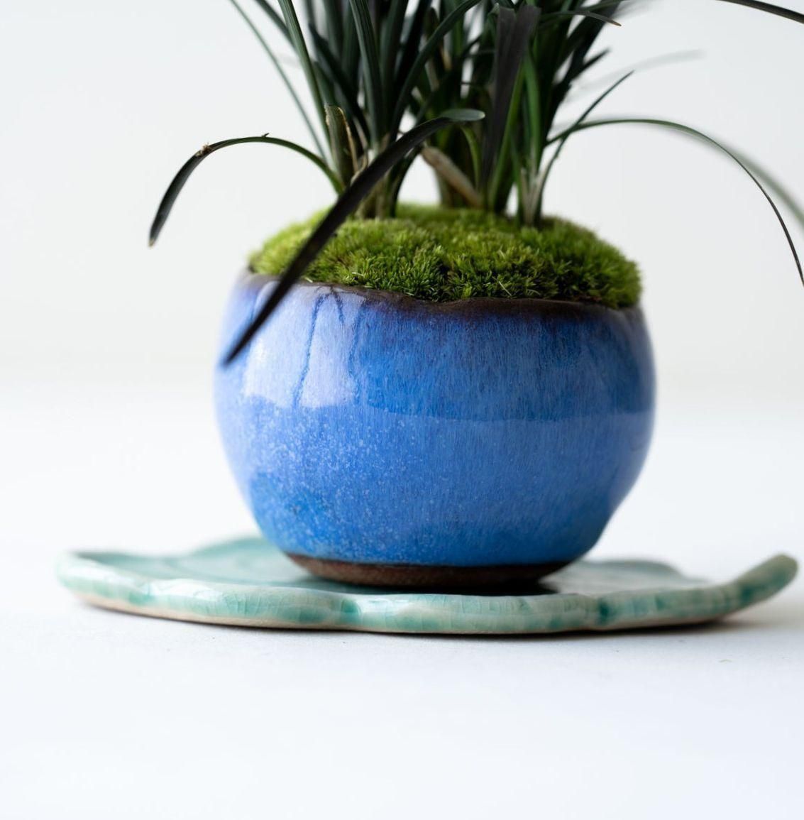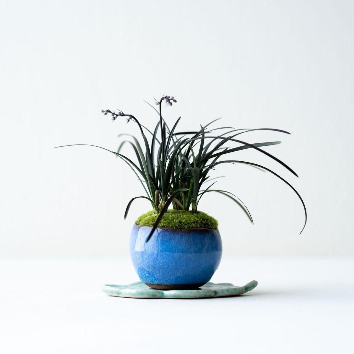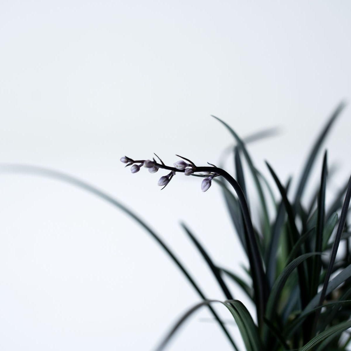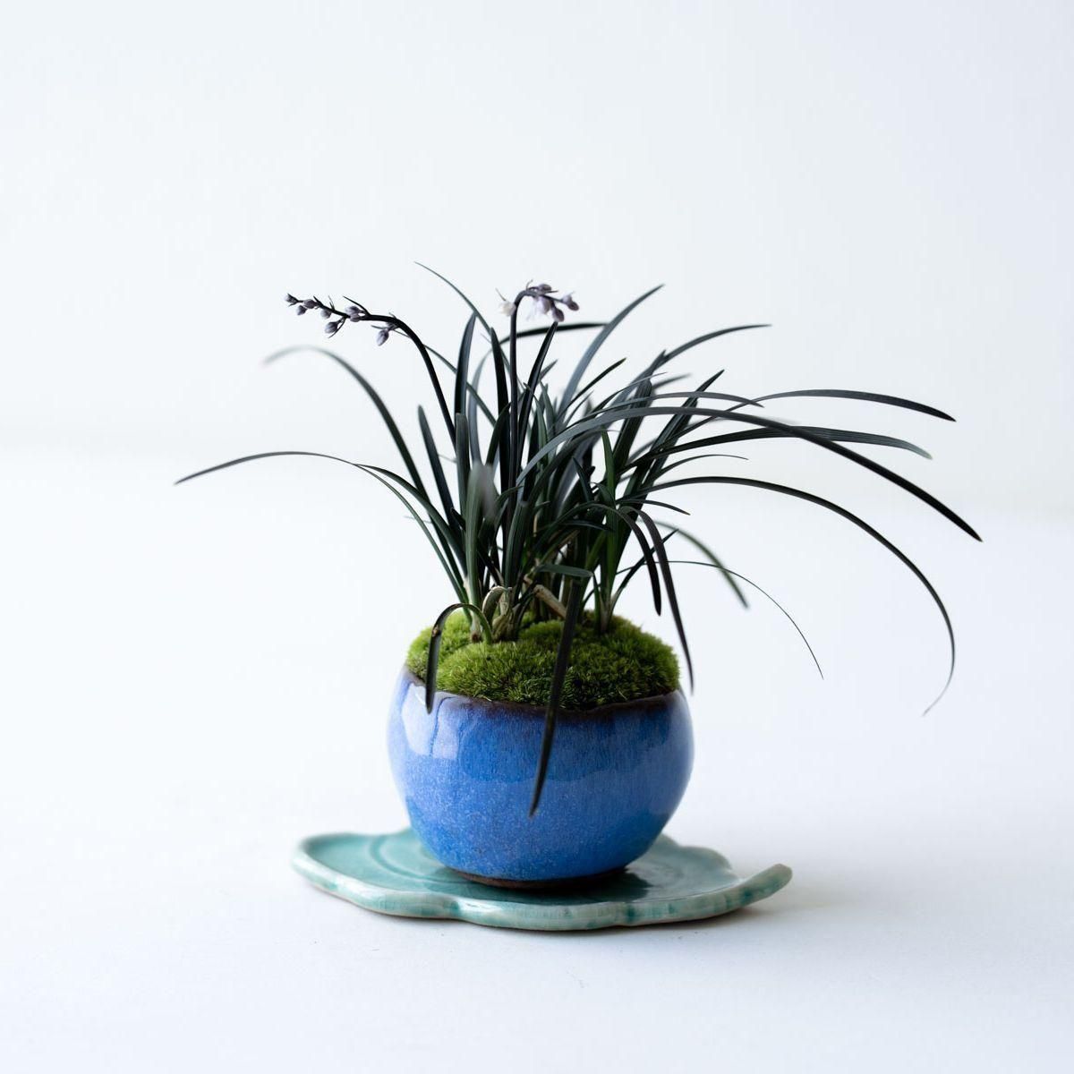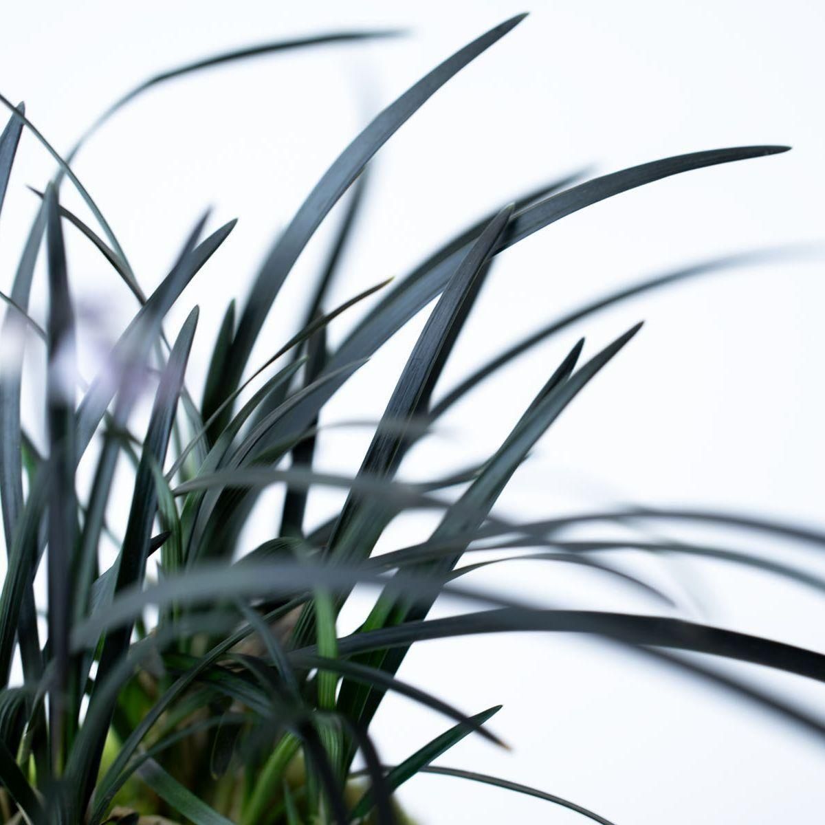 日本庭園などでも親しまれているリュウノヒゲ。その中でもひときわ特異な、漆黒の葉をもつ黒竜。流麗に伸びる黒い葉姿はモダンな印象です。盆栽の「添え」としても優秀で、一緒に飾ると木をよく引き立ててくれます。リュウノヒゲは常緑性で冬も落葉しないため、通年伸びやかな佇まいが楽しめるうえ、非常に強健な性質なので、植物ビギナーの方にもおすすめです。