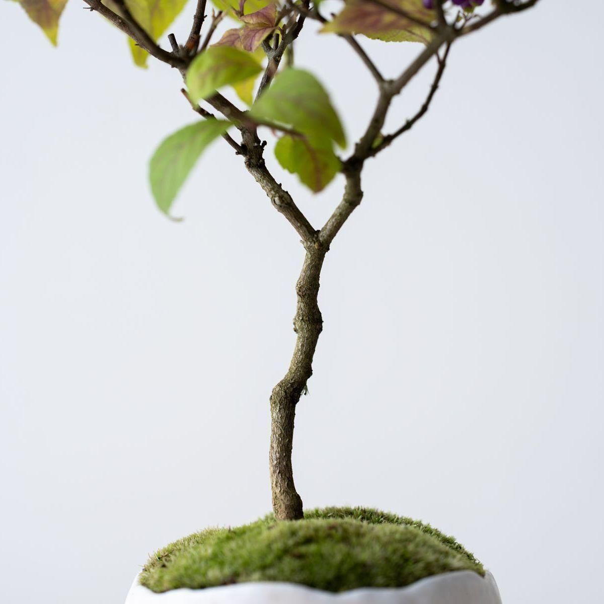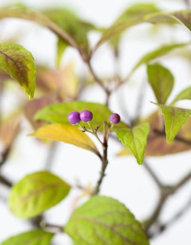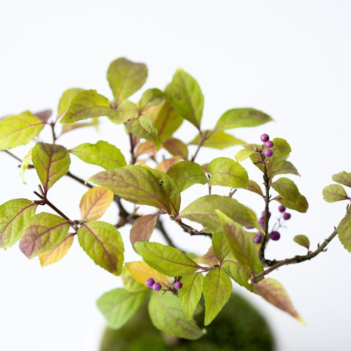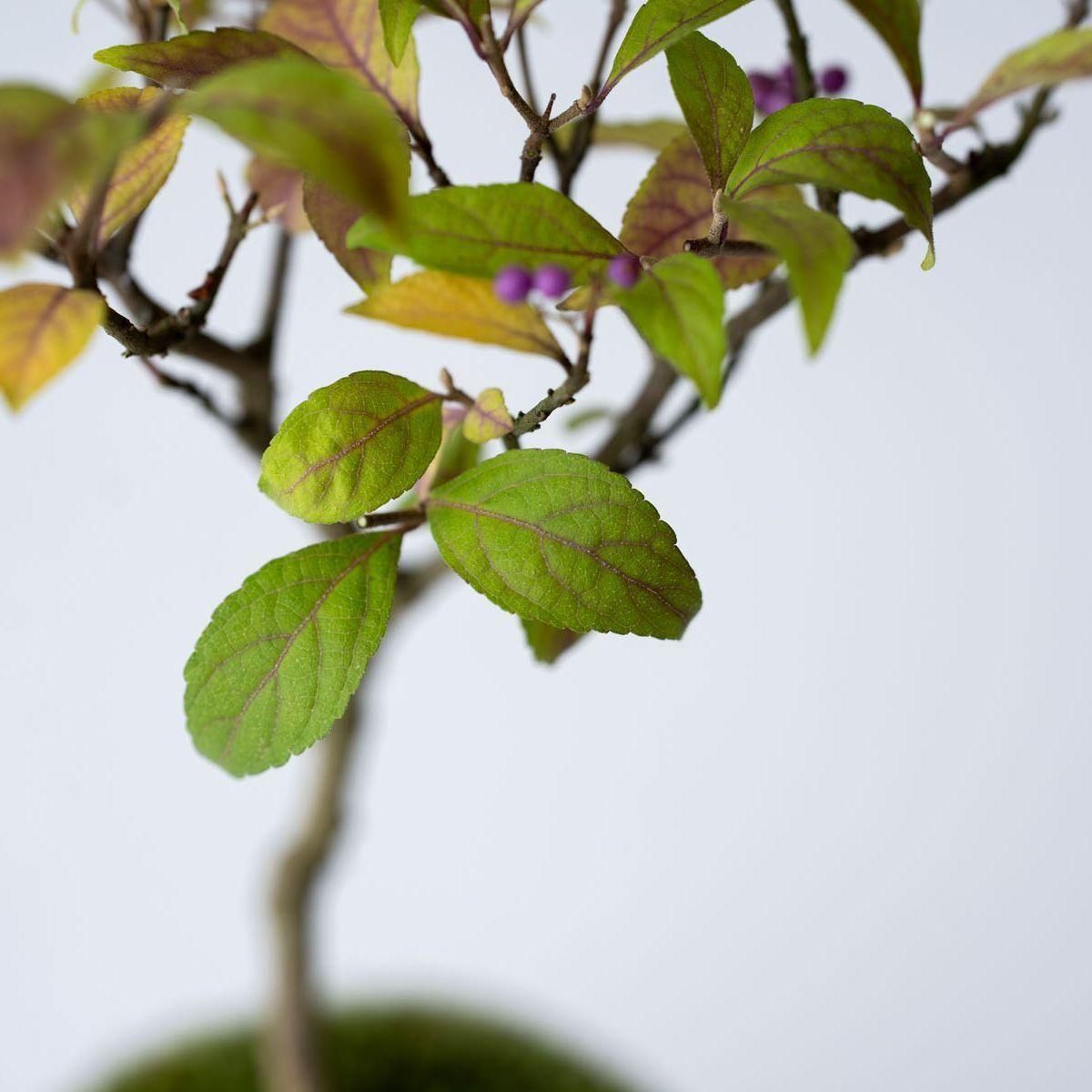 秋に紫色の実をつける姿が美しい樹木です。初夏に開花し、夏に結実した実は10〜11月になると緑色から明るい紫色に熟していきます。そして落葉した後も実は枝先に残り続けるので、冬も侘び寂の風情ある姿を堪能できます。