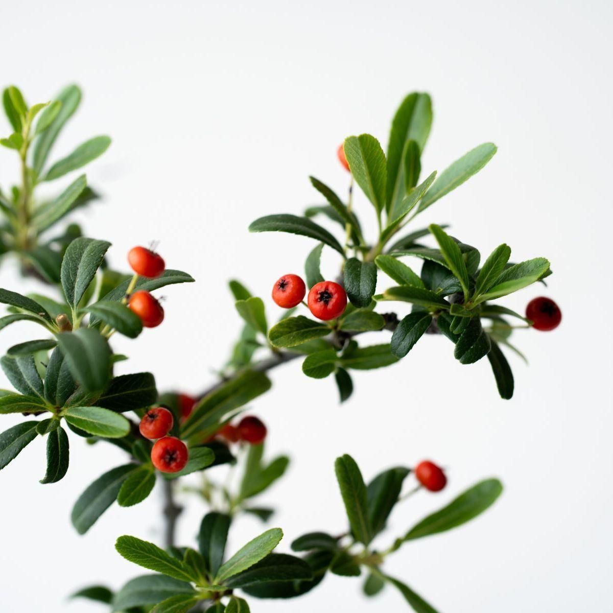 姫トキワサンザシは、葉が小さく細やかな枝ぶりになる(=姫性)トキワサンザシです。小さな白い花を咲かせた後は緑色の実を付け、やがて秋ごろにはまっ赤に色づきます。花付き実付きともに良いので四季折々の変化が楽しい樹種です。また、成長速度も穏やかなので樹形をキープしやすい点もこの木の魅力。
