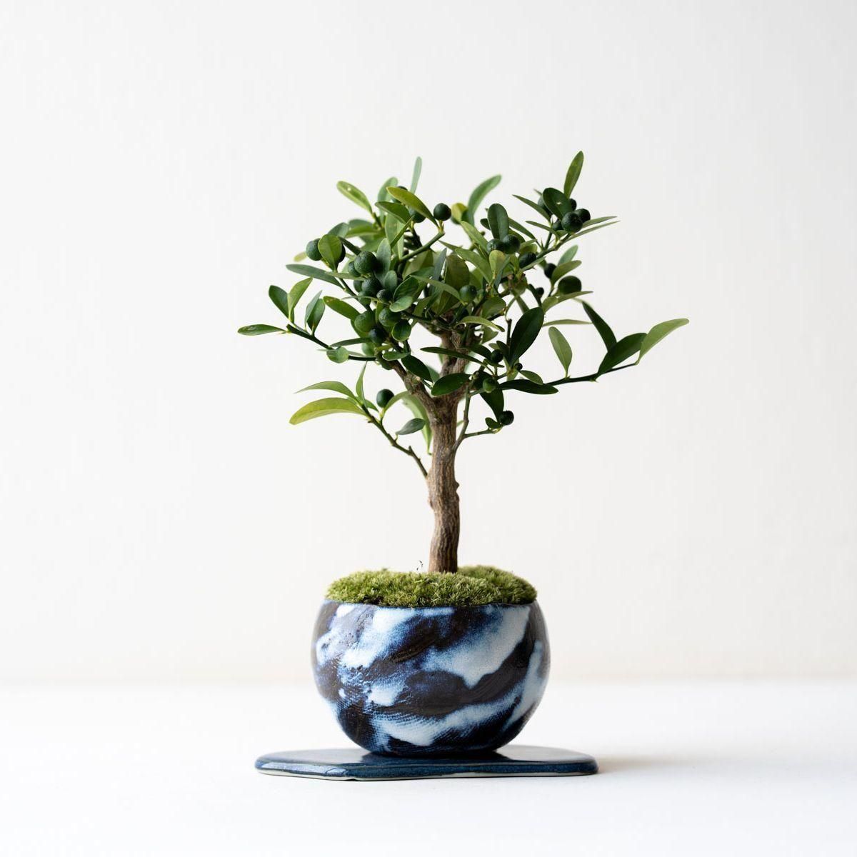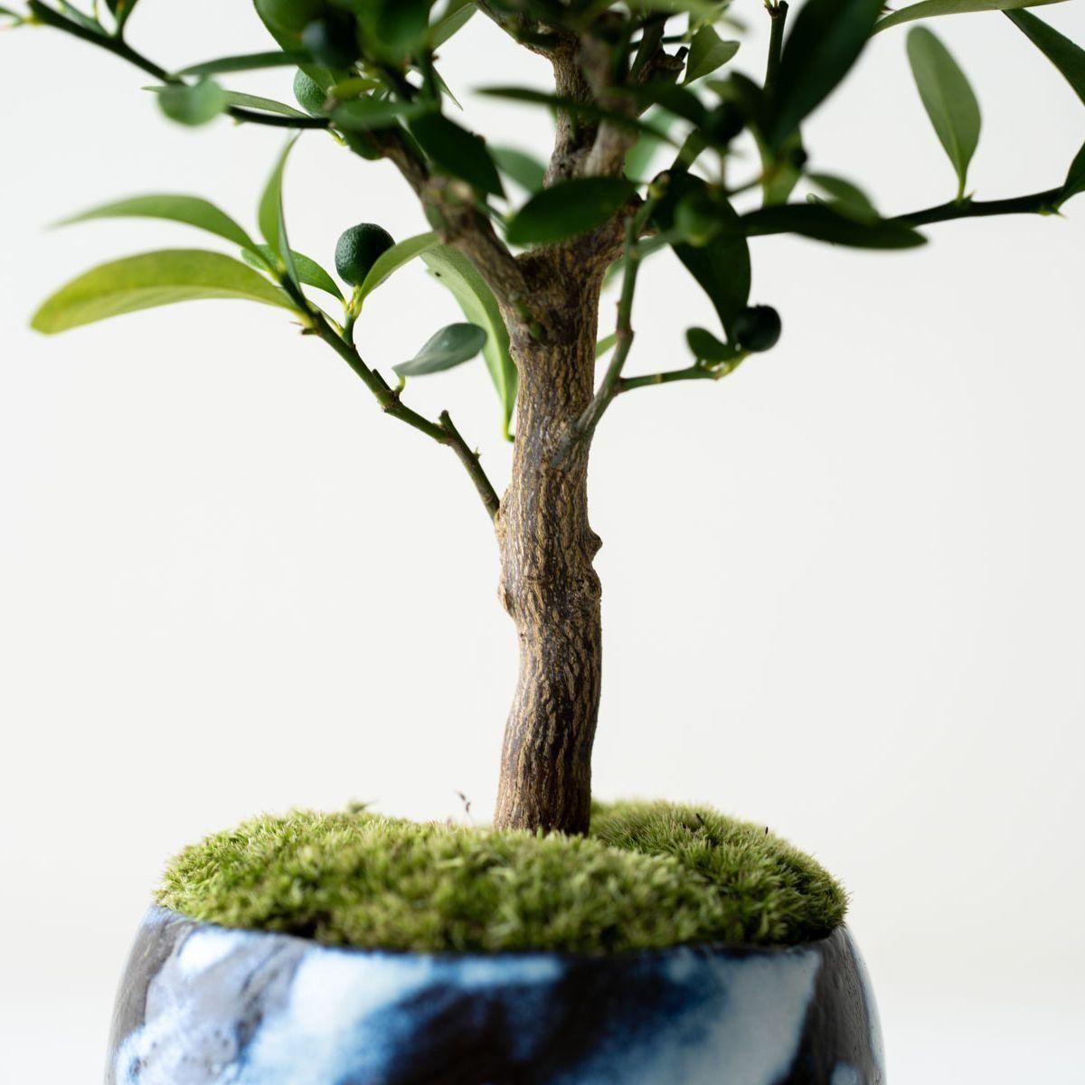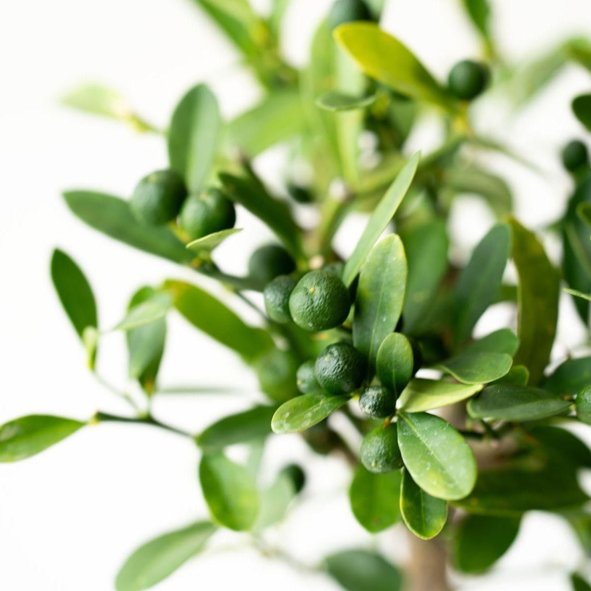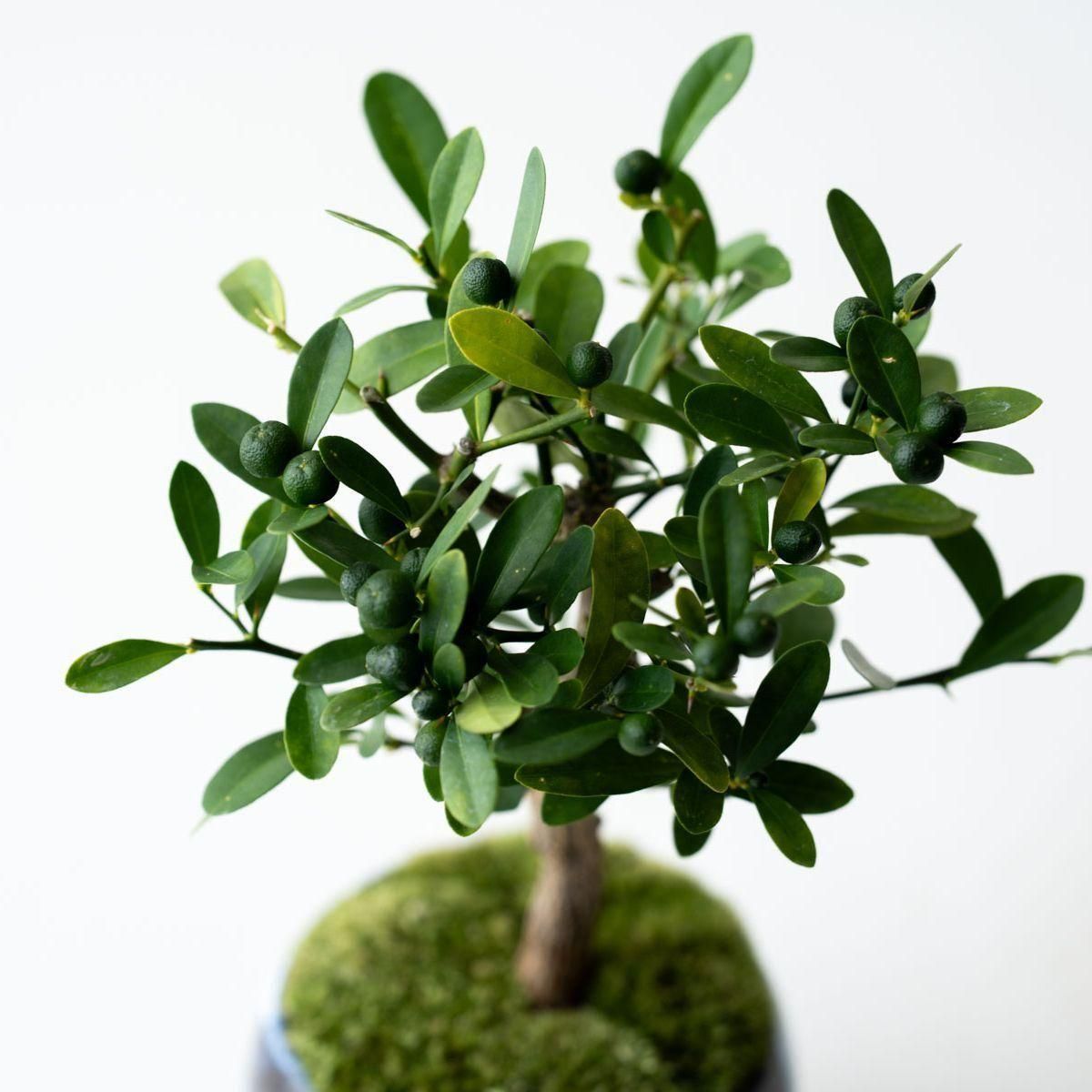 金色の豆と書いて「キンズ」と読みます。この木を表現するのにこれほど秀逸な名前は無さそうです。キンズは柑橘類の中でもっとも小さな種類で、実のサイズは1cm〜1.5cm。緑色の実はこれから徐々に色づいていきます。オレンジ色の実をたっぷりつけた姿は、まるでミニチュアのミカンの木。夏に咲かせる小さな白い花も可愛らしく、魅力の多い樹木です。