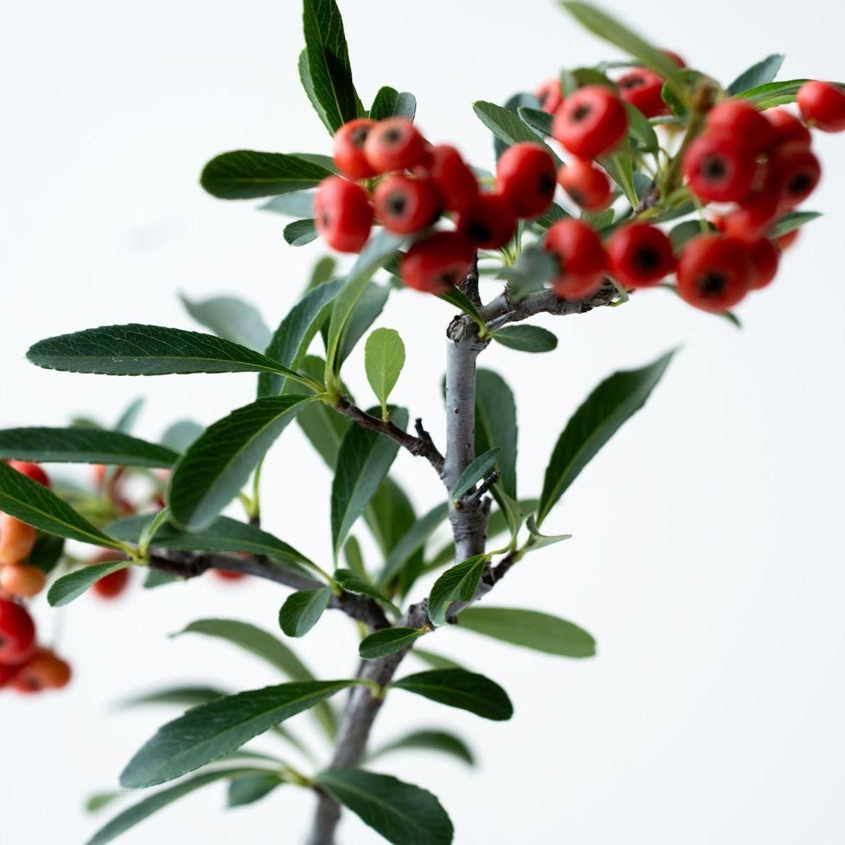 小さな白い花を咲かせた後は、緑色の実を付けるトキワサンザシ。この実は秋にかけて徐々に色づき、美しい朱色に染まります。花付き・実付きともに良いので、四季折々の変化が楽しい樹木です。