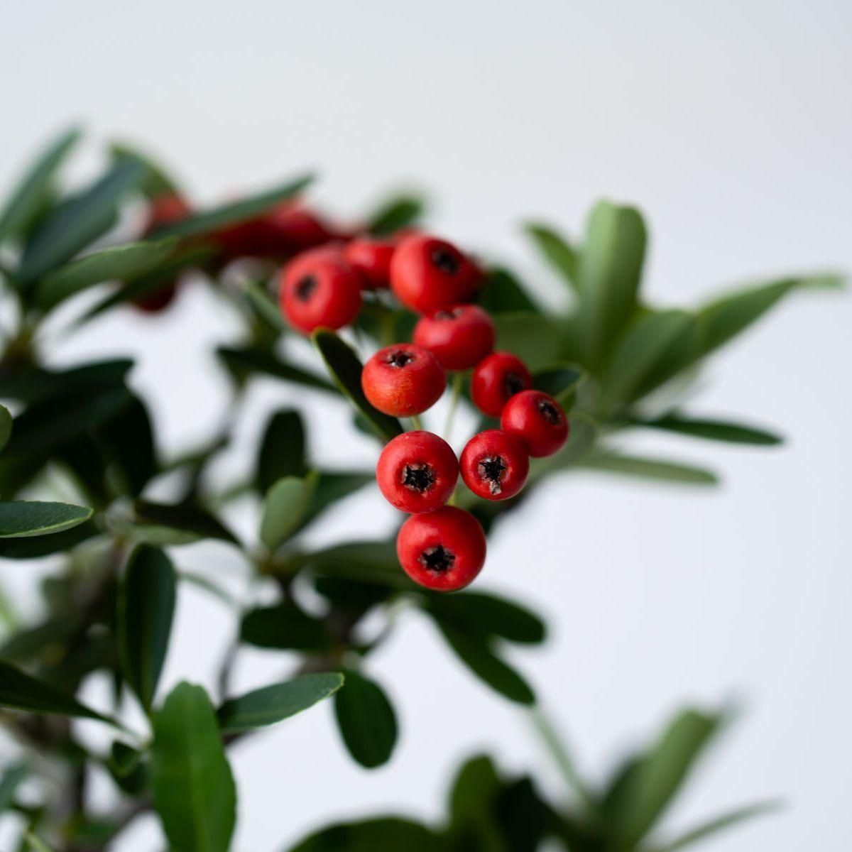 小さな白い花を咲かせた後は、緑色の実を付けるトキワサンザシ。この実は秋にかけて徐々に色づき、美しい朱色に染まります。花付き・実付きともに良いので、四季折々の変化が楽しい樹木です。