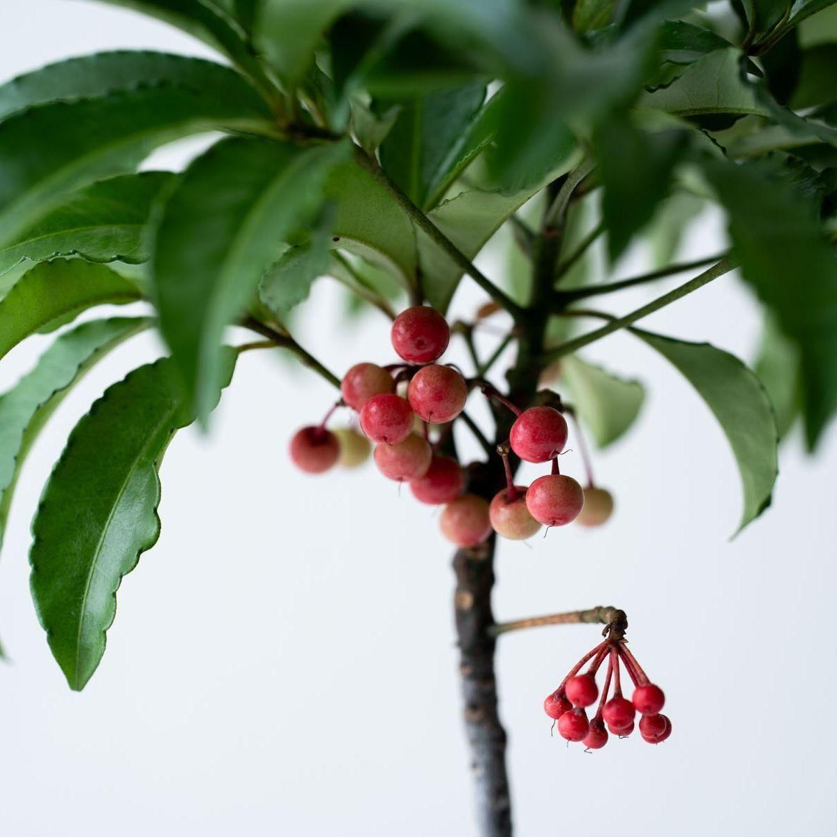 紅色と深い緑のコントラストが美しい万両。シックな印象です。冬の間も落葉しないので、彩りが少ない季節にも鮮やかな潤いをお楽しみいただけます。耐暑性・耐寒性ともに高く、丈夫で育てやすい樹木です。